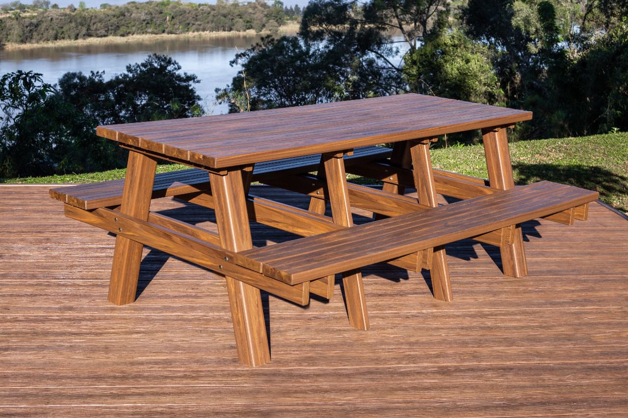 A mesa possui estrutura em madeira plástica que garante longa vida útil e resistência contra intempéries. Sua superfície ampla acomoda confortavelmente várias pessoas, ideal para refeições ao ar livre. Os bancos fixos acoplados facilitam o uso e otimização do espaço.